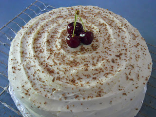 Then ice with a final layer of buttercream. Make sure this layer is nice and smooth! Garnish with fresh cherries and grated chocolate to give people and idea of what's in the cake. Enjoy!
